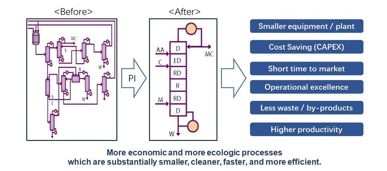 沈潇博士指出,与放大生产规模的思路相反,强化工艺是指在更小的反应器里通过工艺优化去实现更高质量的目标产物,这其中不仅是工艺规模的减少,还包括时间与费用的成本降低。强化工艺可以提高运营效率,加速药物研发进度。