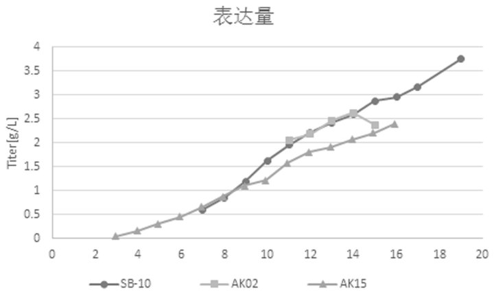 图 4. 蛋白表达量。SB-10:环轨摇晃式生物反应器;AK02:3 L搅拌式生物反应器;AK15:15 L搅拌式生物反应器