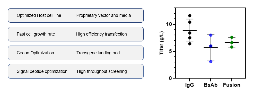 A variety of cell lines available for development and commercial manufacturing: including CHO-K1, DG44, DXB11 and CHO-Express